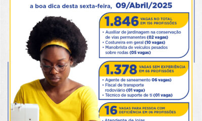 A indicação da Fundação Social do Trabalho (Funsat), para a intermediação da sua Agência de Empregos é de 1.846 vagas disponíveis. Recrutamento anunciado, nesta sexta-feira (9),...