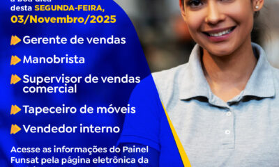 A Fundação Social do Trabalho (Funsat) divulgou 1.286 oportunidades de emprego em 154 profissões para os próximos dias. O atendimento na Agência de Empregos será mantido...