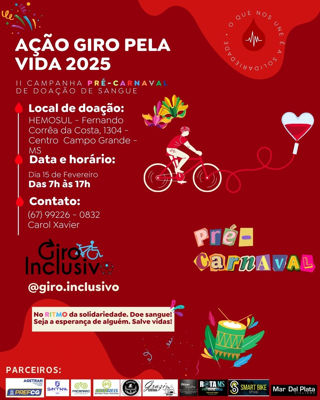 A Agetran, em parceria com o Projeto Giro Inclusivo, convida toda a população a participar da II Campanha Pré-Carnaval de Doação de Sangue – Ação Giro pela Vida 2025. O evento será realizado no próximo sábado, dia 15 de fevereiro, das 7h às 17h, no Hemosul, localizado na Av. Fernando Corrêa da Costa, nº 1304.