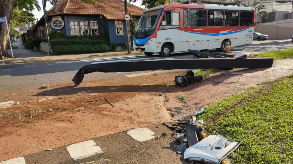 Imagens mostram a base de ferro do semáforo destruída e caída ao chão. Motoristas que passam pelo trecho devem redobrar a atenção.