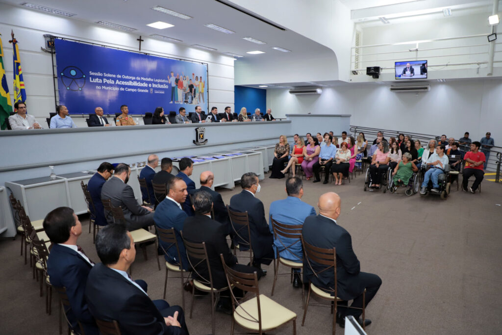 A Câmara Municipal de Campo Grande realizou, nesta segunda-feira (5), sessão solene de outorga da Medalha Legislativa “Luta pela Acessibilidade e Inclusão”. A homenagem foi criada na Casa de Leis por meio da Resolução nº 1.331/19, de autoria do vereador Papy.