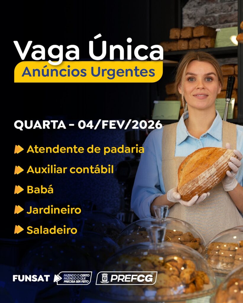 A Fundação Social do Trabalho (Funsat) disponibiliza, nesta quarta-feira (4), um total de 1.168 vagas de emprego, ofertadas por 123 empresas de Campo Grande. As oportunidades abrangem 114 profissões diferentes e estão disponíveis exclusivamente para candidatos com cadastro atualizado no Sine (Sistema Nacional do Emprego).