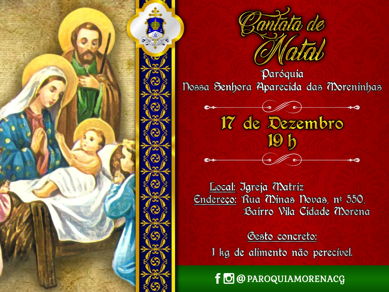 Pelo terceiro ano a Paróquia Nossa Senhora Aparecida das Moreninhas vai realizar uma “Cantata de Natal” uma apresentação musical que conta através da música a história do nascimento de Jesus e resgata o sentido do verdadeiro Natal. A apresentação vai acontecer neste sábado, dia 17, às 19h.