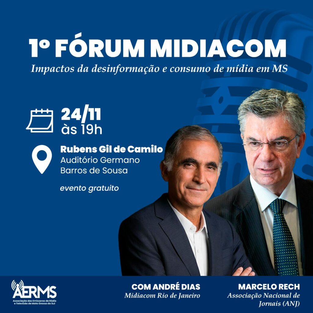 A Associação das Emissoras de Rádio e Televisão de MS (AERMS), realiza no dia 24 de novembro, o 1º Fórum MIDIACOM-MS. Com o tema “Impactos da desinformação e consumo de mídia em MS”, o evento tem o objetivo de debater e buscar caminhos no combate à desinformação.
