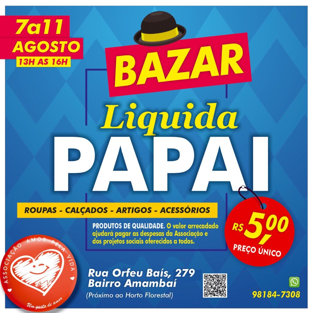 Para ampliar essa rede de amor ao próximo e manter os projetos funcionando e, se Deus quiser, abrir novas oportunidades em outras atividades, a Associação Amor Pela Vida realizará entre os dias 7 e 11 de agosto, o Bazar Liquida Papai, com a temática para o Dia dos Pais. É importante destacar que o bazar que fica fixo na sede da Associação tem de tudo um pouco e tudo bem conservado e de qualidade, entre roupas, agasalhos, calçados, objetivos, utensílios e muito mais, tanto masculino quanto feminino.