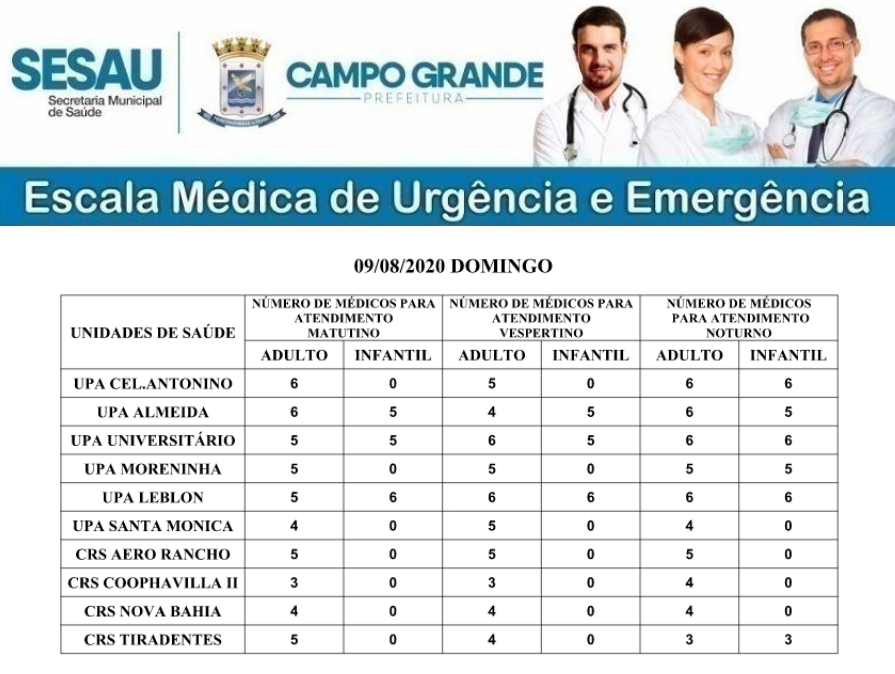 Confira a escala médica de plantão nas UPAs e CRSs nesse domingo dia 09 de agosto de 2020.