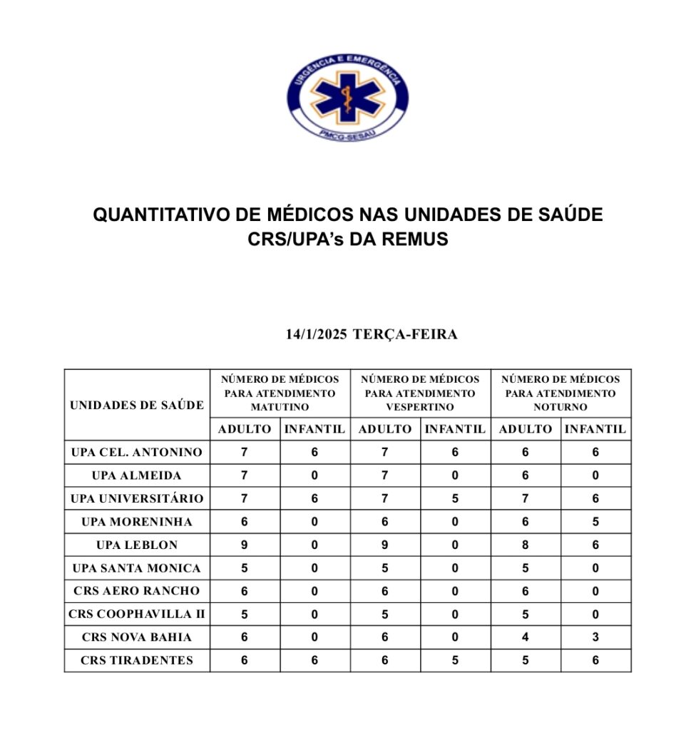 Confira a escala médica de plantão nas UPAs e CRSs nesta terça-feira (14) Sol Santandher/ Cesar ferreira ✅ 1 ano atrás