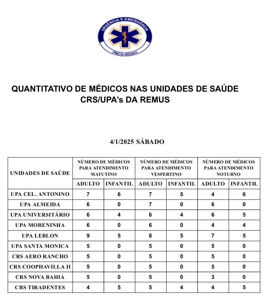 Confira a escala médica nas UPAs e CRSs neste sábado, dia 04 de janeiro de 2025 Sol Santandher/ Cesar ferreira ✅ 1 ano atrás