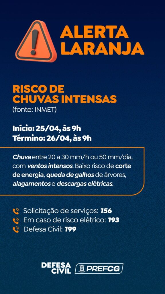 A Defesa Civil Municipal de Campo Grande informa que o Instituto Nacional de Meteorologia (INMET) emitiu Alerta Laranja para risco de chuvas intensas na Capital. O aviso meteorológico tem início às 9h desta sexta-feira (25/04) e segue até às 9h de sábado (26/04).