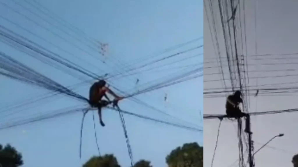Subir nos fios para furtá-los. Já tinha visto essa? Um homem, ainda sem identificação, foi flagrado justamente nessa posição. O caso ocorreu na tarde desta quarta-feira (28), no Parque do Lageado, em Campo Grande.