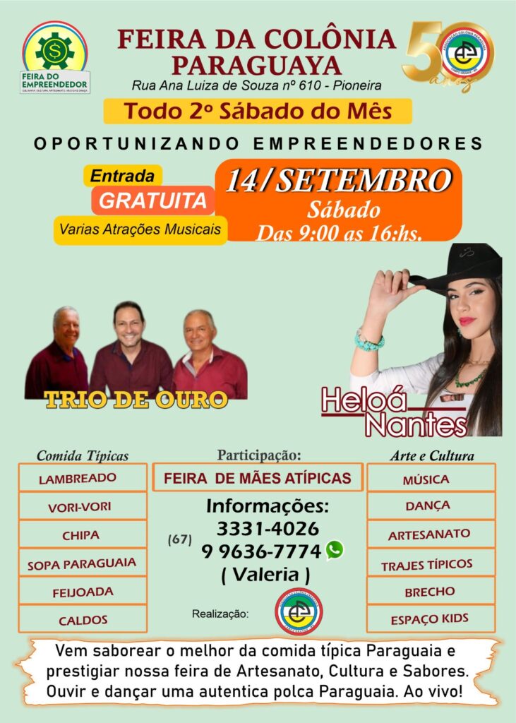 A feira será no dia 14 de setembro, das 9h às 16h, na Colônia Paraguaya na Rua Ana Luiza de Souza, 610 – Pioneira. Entrada gratuita!