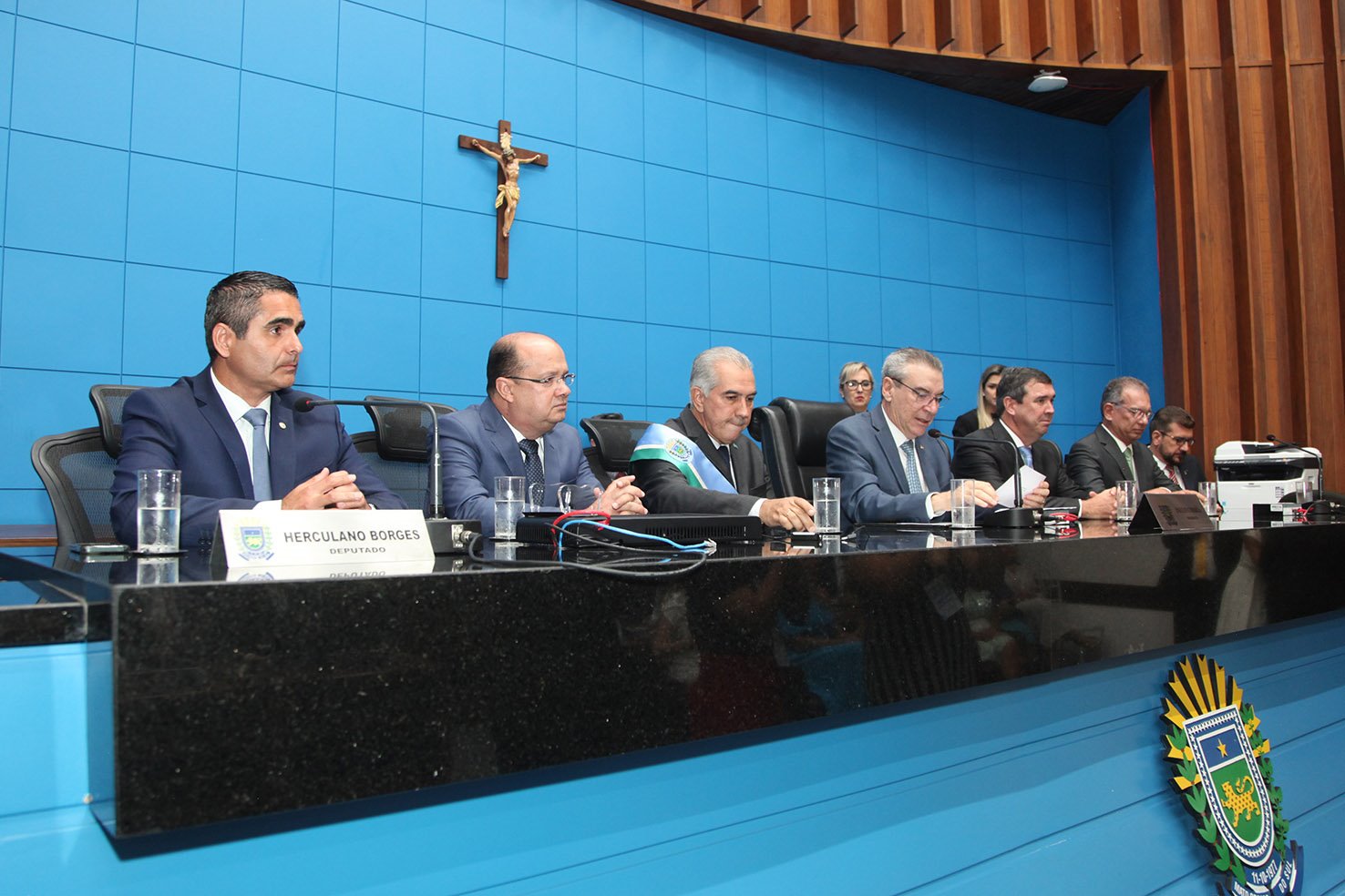A mesa de autoridades foi composta pelo presidente da ALEMS, Paulo Correia, e deputados Herculano Borges (Republicanos) e Pedro Kemp (PT), além do presidente do Tribunal de Justiça de Mato Grosso do Sul (TJMS), desembargador Carlos Eduardo Contar. O governador Reinaldo Azambuja, o governador eleito Eduardo Riedel e o vice-governador eleito, Barbosinha, foram conduzidos ao plenário pela comissão composta pelos deputados Londres Machado (PP), Antonio Vaz (Republicanos) e Professor Rinaldo Modesto (Podemos).
