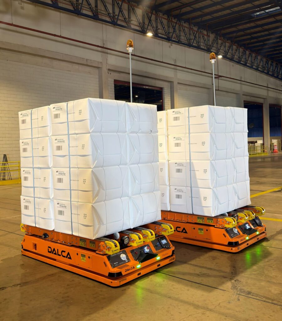 Desenvolvido de forma customizada para atender às necessidades da companhia, o FlexNav tem capacidade para transportar até quatro toneladas e foi projetado para acomodar dois conjuntos de fardos de celulose por operação. Os robôs operam de forma totalmente autônoma, conectados em tempo real a um sistema central que monitora e coordena as atividades, incluindo a gestão do carregamento das baterias. A solução permite que a celulose seja retirada diretamente da linha de produção e transportada até pontos específicos do armazém, sem necessidade de manuseio manual.