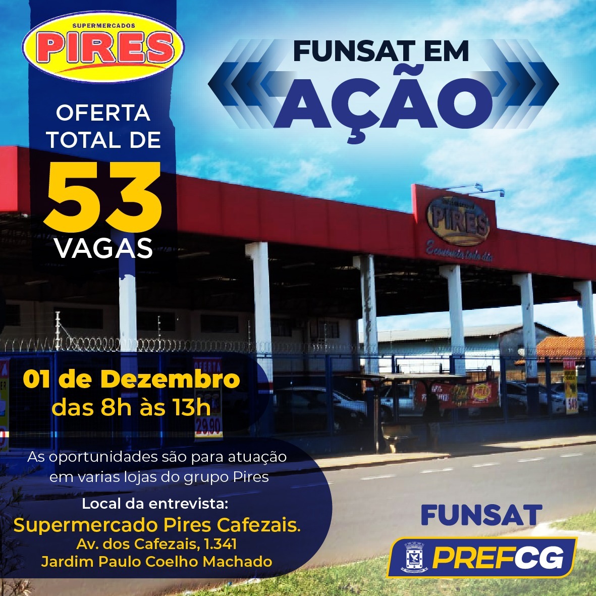 A ação acontecerá das 8h às 13h no Supermercado Pires localizado na Avenida dos Cafezais, 1.341, Jardim Paulo Coelho Machado. As vagas são para atuação em 8 (oito) diferentes lojas da rede.