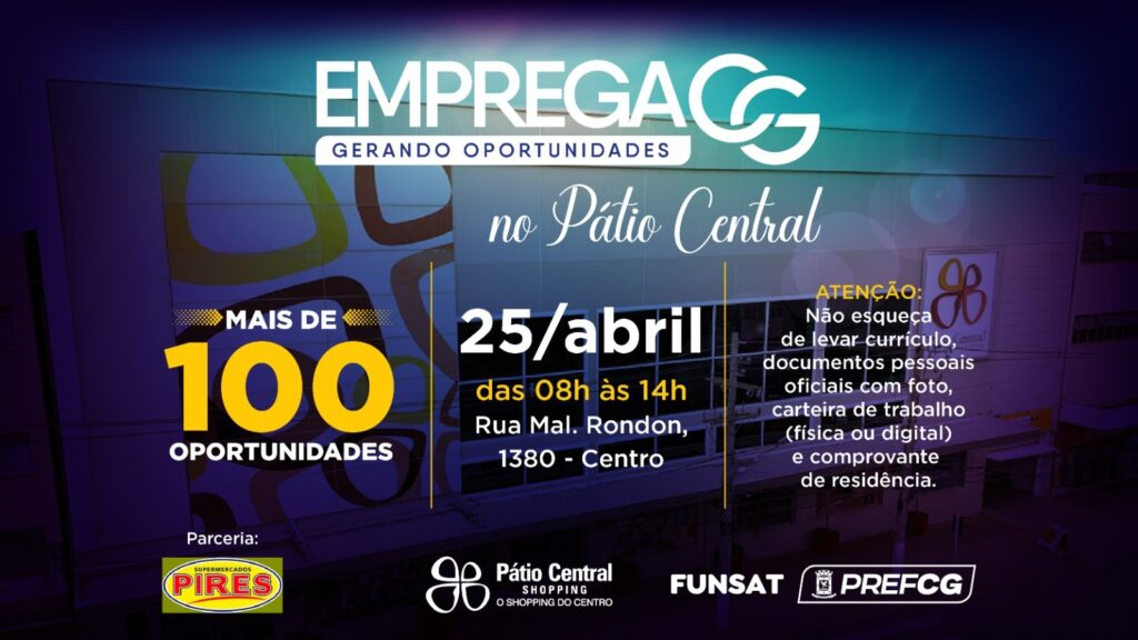 Em parceria com o Supermercado Pires, a Fundação Social do Trabalho (Funsat) estará no Pátio Central Shopping, nesta quinta-feira, dia 25 de abril, para mais uma edição do Emprega CG. A ação acontece das 8h às 14h, sendo ofertadas mais de 100 oportunidades em diferentes áreas e funções.