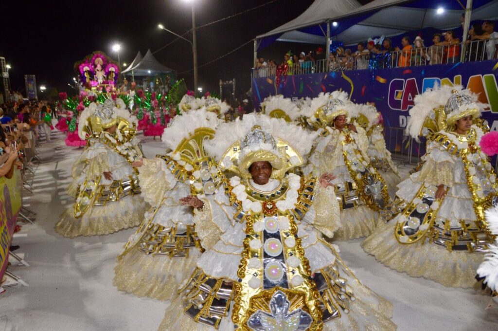 A primeira escola a entrar na avenida foi a Vila Carvalho, que apresentou o enredo “A força de Dona Inês”, exaltando a história da matriarca da agremiação, a representatividade feminina e a força das mulheres.