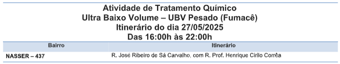 O combate ao mosquito Aedes Aegypti, transmissor de arboviroses como Dengue, Zika e Chikungunya, será reforçado na região da Vila Nasser, com o uso do serviço de borrifação ultrabaixo volume (UBV) – conhecido como Fumacê, nesta terça-feira (27).