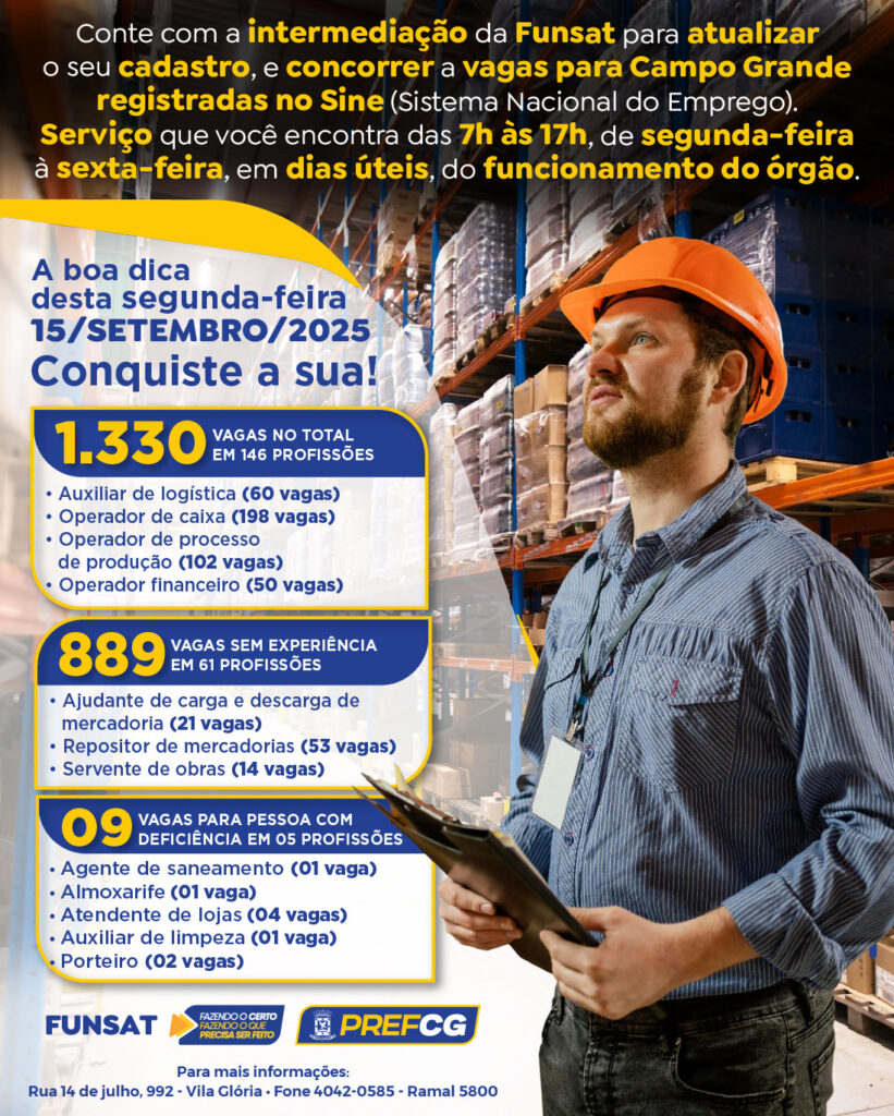 A Agência de Empregos da Fundação Social do Trabalho (Funsat) oferece nesta segunda-feira (15), o total de 1.330 vagas, das quais, em 889 chamados, a entrevista do proponente não exige experiência para a contratação. São 146 funções diferentes, num total de 188 empresas parceiras.