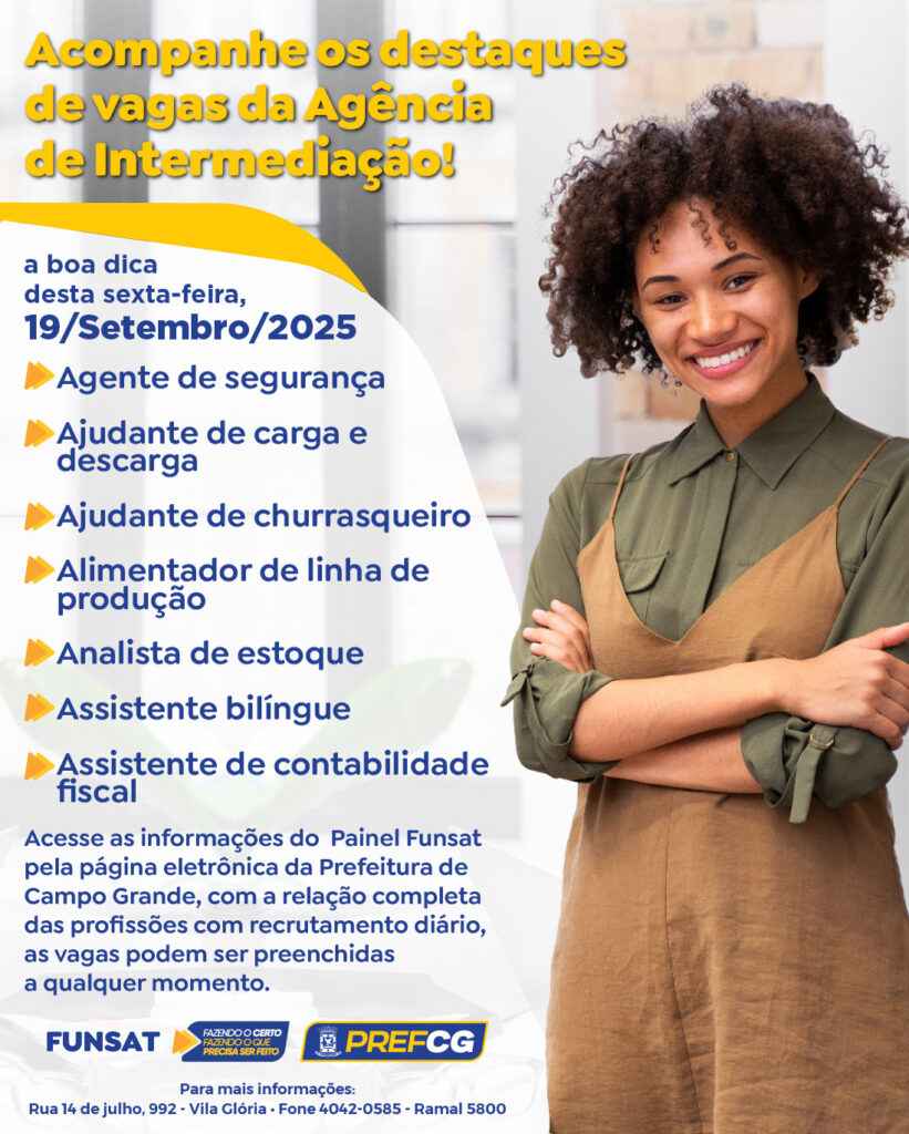 No dia 18 de setembro, a Funsat (Fundação Social do Trabalho) comemorou 24 anos de atuação, com destaque para as ações da Diretoria de Vagas e Emprego, que trabalharam em duas frentes de intermediação de mão de obra. Para esta sexta-feira (19), a fundação disponibilizou um total de 1.417 vagas em 151 profissões, com a participação de 192 empresas de Campo Grande, que não exigem experiência para diversas funções.