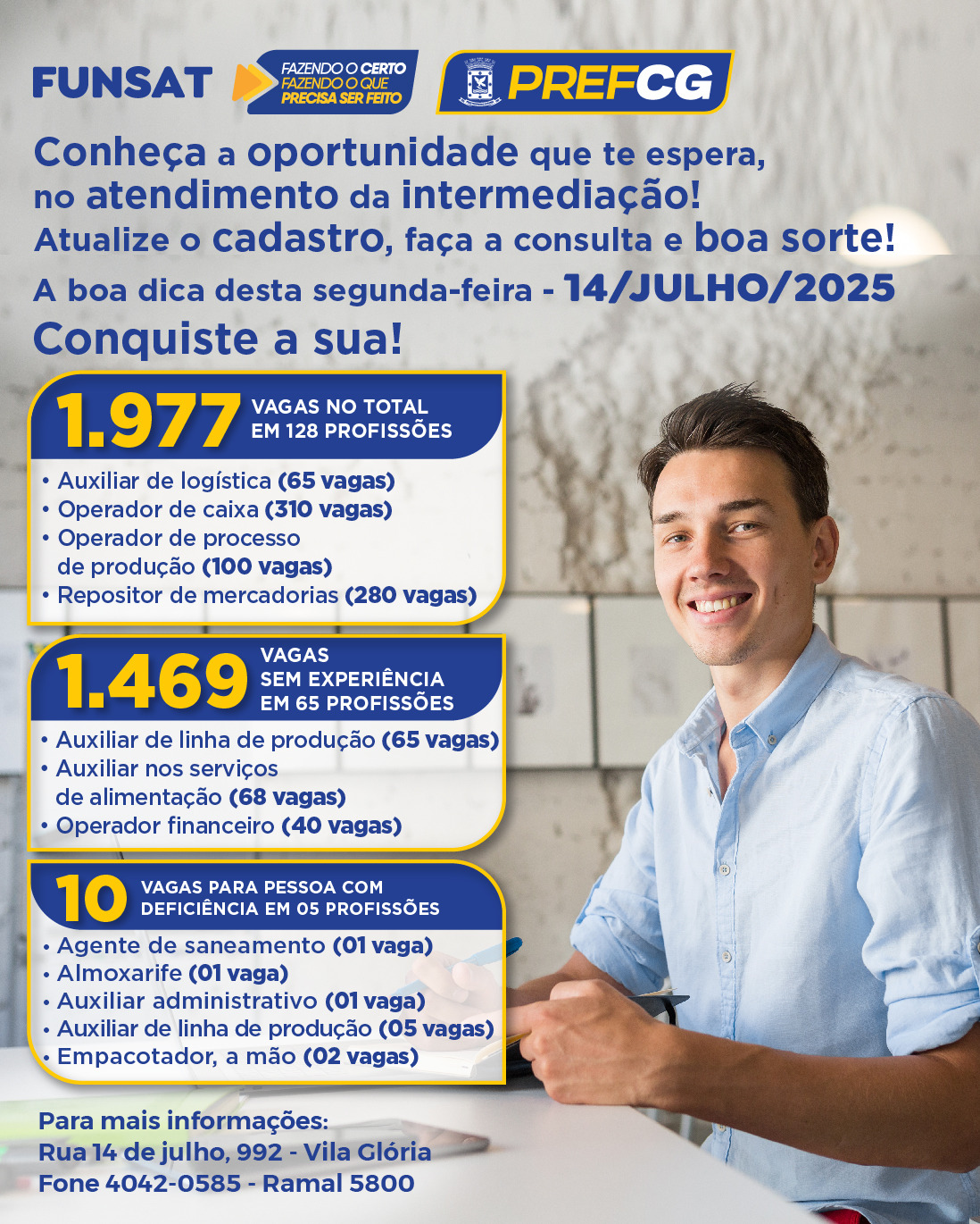 A semana começa com 1.977 oportunidades de emprego intermediadas pela Fundação Social do Trabalho (Funsat), conforme o painel de vagas desta segunda-feira (14). As vagas são oferecidas por 191 empresas da Capital e abrangem 128 diferentes profissões. Do total de vagas, 1.469 não exigem experiência prévia, o que amplia o acesso de candidatos em busca do primeiro emprego ou de recolocação no mercado.