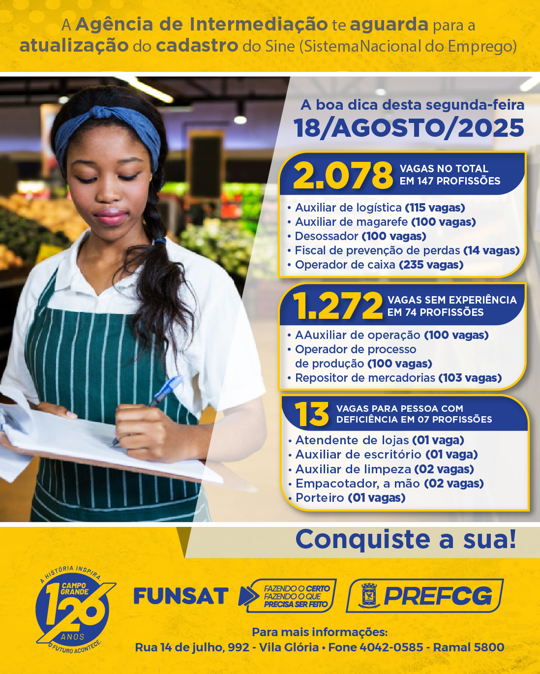 A Fundação Social do Trabalho de Campo Grande (Funsat) inicia esta semana com recorde no mês de agosto: 206 empresas estão com vagas abertas no Painel de Vagas da instituição. Ao todo, são centenas de oportunidades em diversas áreas, abrangendo desde funções que exigem experiência até cargos de perfil aberto e exclusivas para Pessoas com Deficiência (PCD).