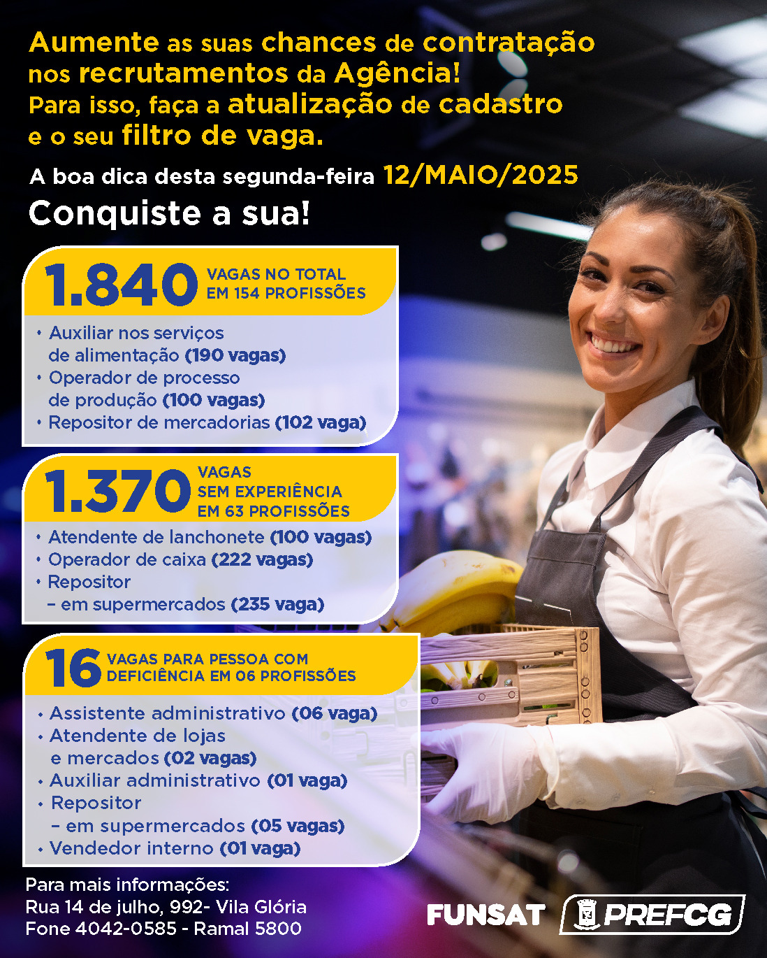 A Agência de Empregos da Funsat (Fundação Social do Trabalho) reabre, nesta segunda-feira (12), com 1.840 vagas disponíveis.  São ofertas de emprego de 193 empresas de Campo Grande, em 154 profissões diferentes, e acessíveis a quem estiver com o cadastro em dia no órgão.