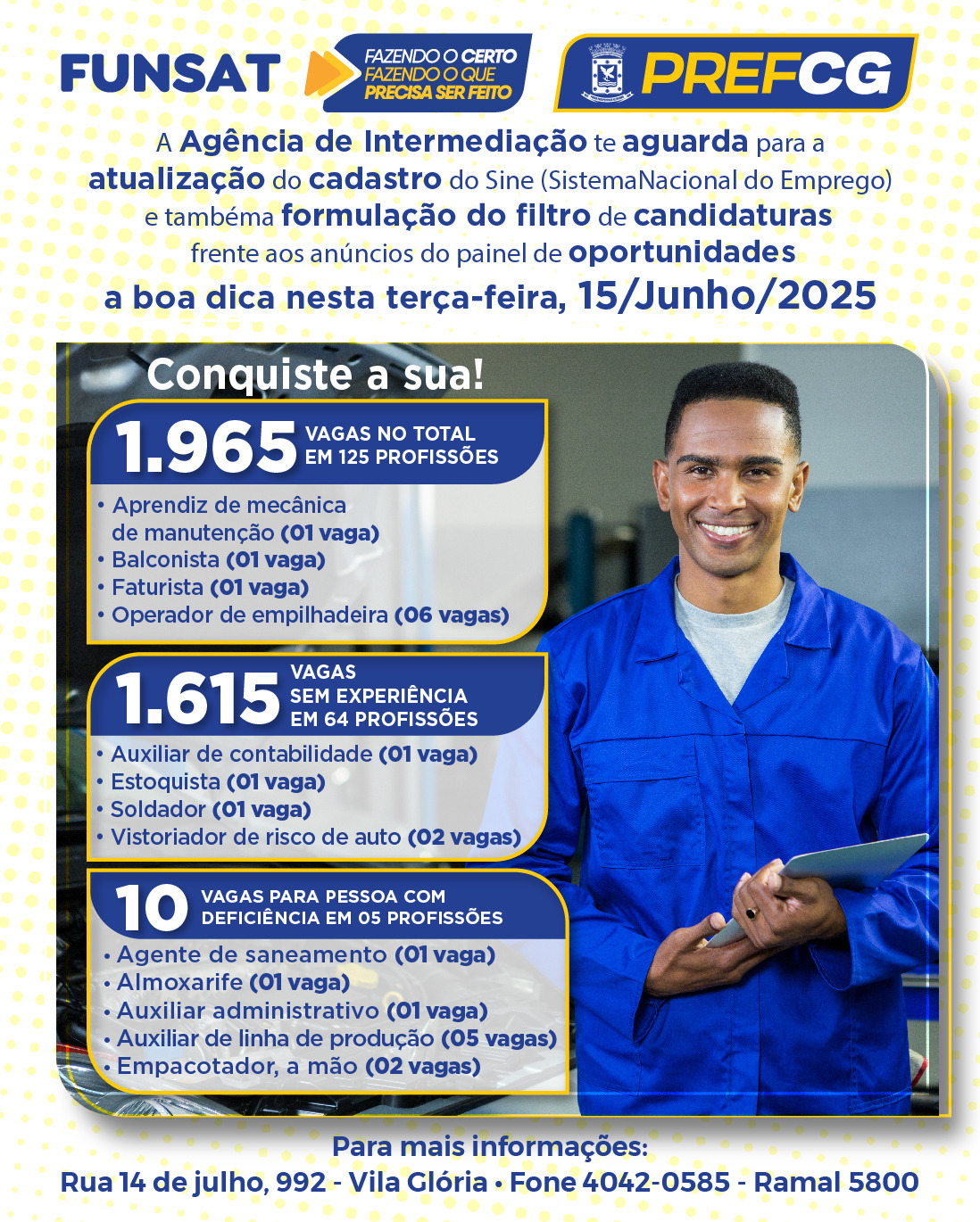A Agência de Empregos da Funsat (Fundação Social do Trabalho) divulga, nesta terça-feira (15), oportunidades de emprego em 193 empresas de Campo Grande. Os anunciantes ofertam 1.965 vagas, ligadas a 125 funções diferentes e as chances de contratação estão disponíveis apenas a quem estiver com o cadastro em dia no órgão.