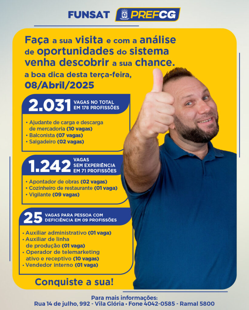 A Funsat (Fundação Social do Trabalho) divulga, nesta terça-feira (8), 2.031 vagas de emprego intermediadas por 215 empresas, abrangendo 178 diferentes profissões.