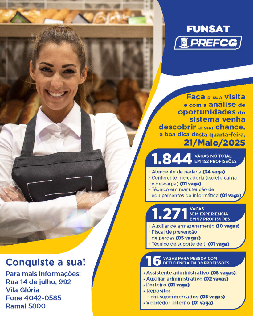 A Fundação Social do Trabaljo (Funsat) oferta nesta quarta-feira (21) 01.844 vagas, referentes a 152 profissões diferentes de 193 empresas, sendo 30% das funções, sem exigir experiência para as contratações pendentes.