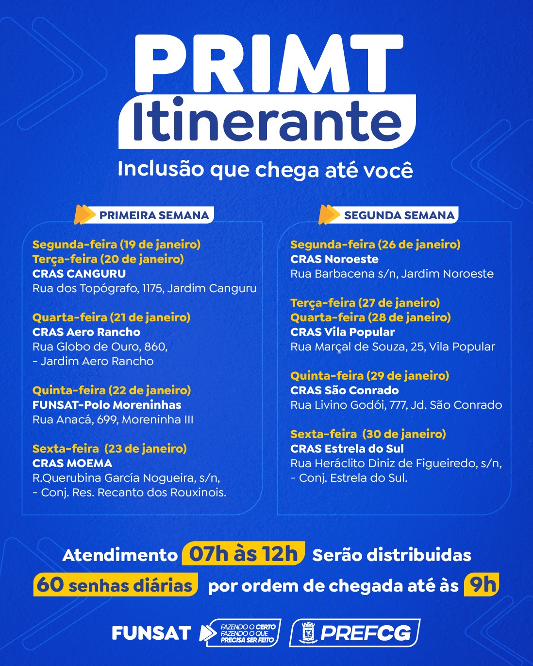 A partir de segunda-feira (19), a Funsat inicia um novo período de inscrições do projeto “Primt Itinerante”, que irá abranger todas as regiões de Campo Grande. Serão realizadas captações de novas candidaturas para o Cadastro Reserva, que atenderá convocações de, pelo menos, 200 beneficiários em fevereiro, além de novas chamadas previstas para o primeiro semestre de 2026.
