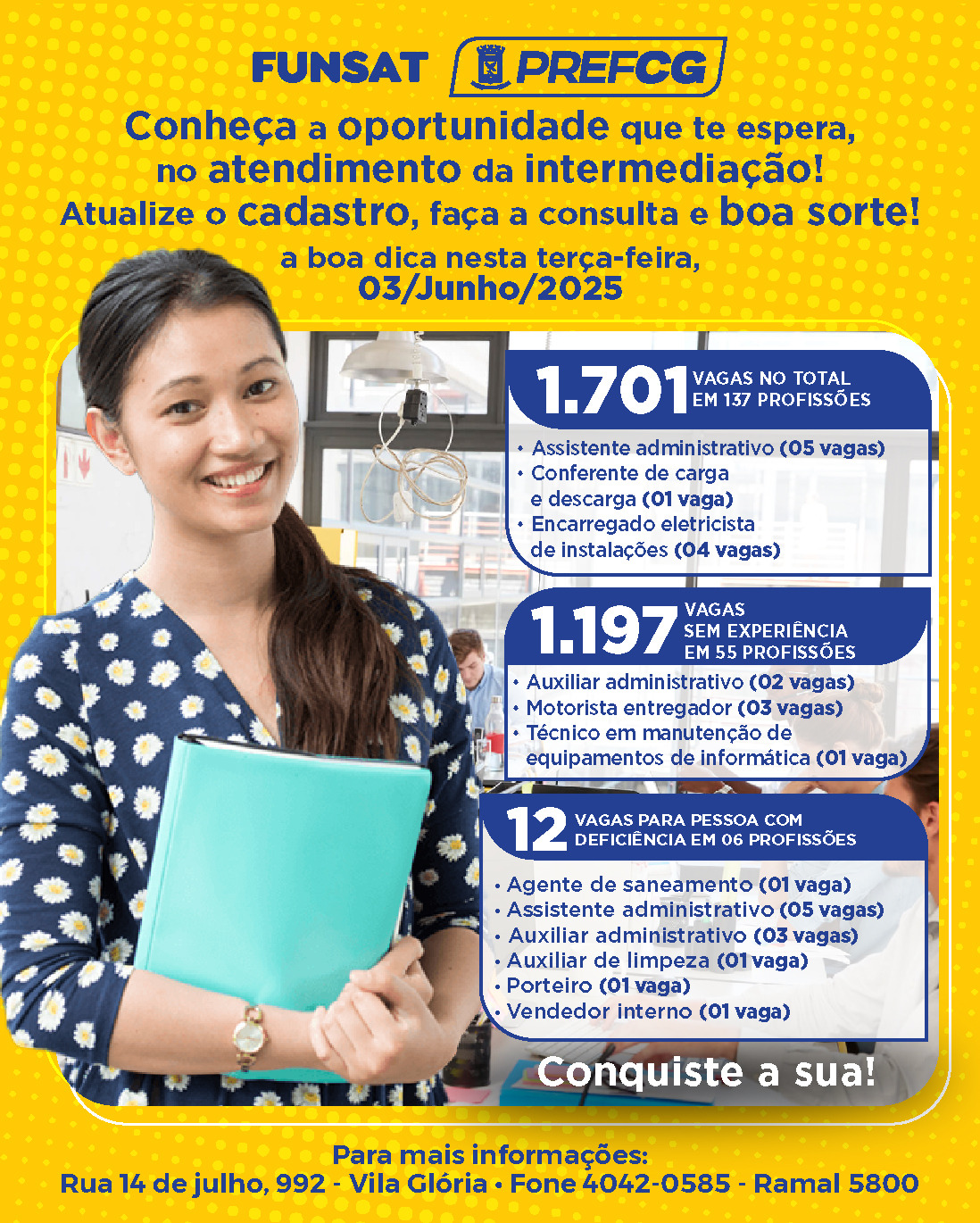 O painel de Intermediação da Agência de Empregos da Funsat (Fundação Social do Trabalho) para esta terça-feira (3), oferta a divulgação de 1.701 vagas, oportunidades de contratação em 181 empresas de Campo Grande, que recrutam para 137 profissões.