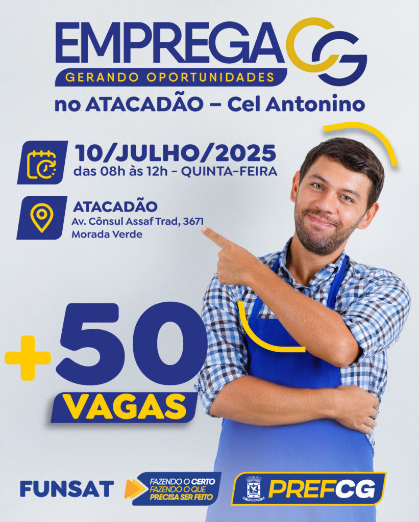 Na quinta-feira (10) a atividade do Emprega CG será no bairro Coronel Antonino, com 50 vagas, de dez funções diferentes: operador de caixa, repositor, atendente de frios em padaria, atendente de açougue, auxiliar de açougue, açougueiro, fiscal na prevenção de perdas, auxiliar de depósito, conferente de mercadorias, e empacotador. A triagem será para encaminhamentos de novos colaboradores a lojas do grupo Atacadão em Campo Grande. O telefone para dúvidas e orientações, a respeito dos eventos do Emprega CG é o (67) 4042-0585/Ramal 5841. Acompanhe ainda as novidades pelo perfil no Instagram @funsat.cg, onde é possível conferir a proposta de cada edição.