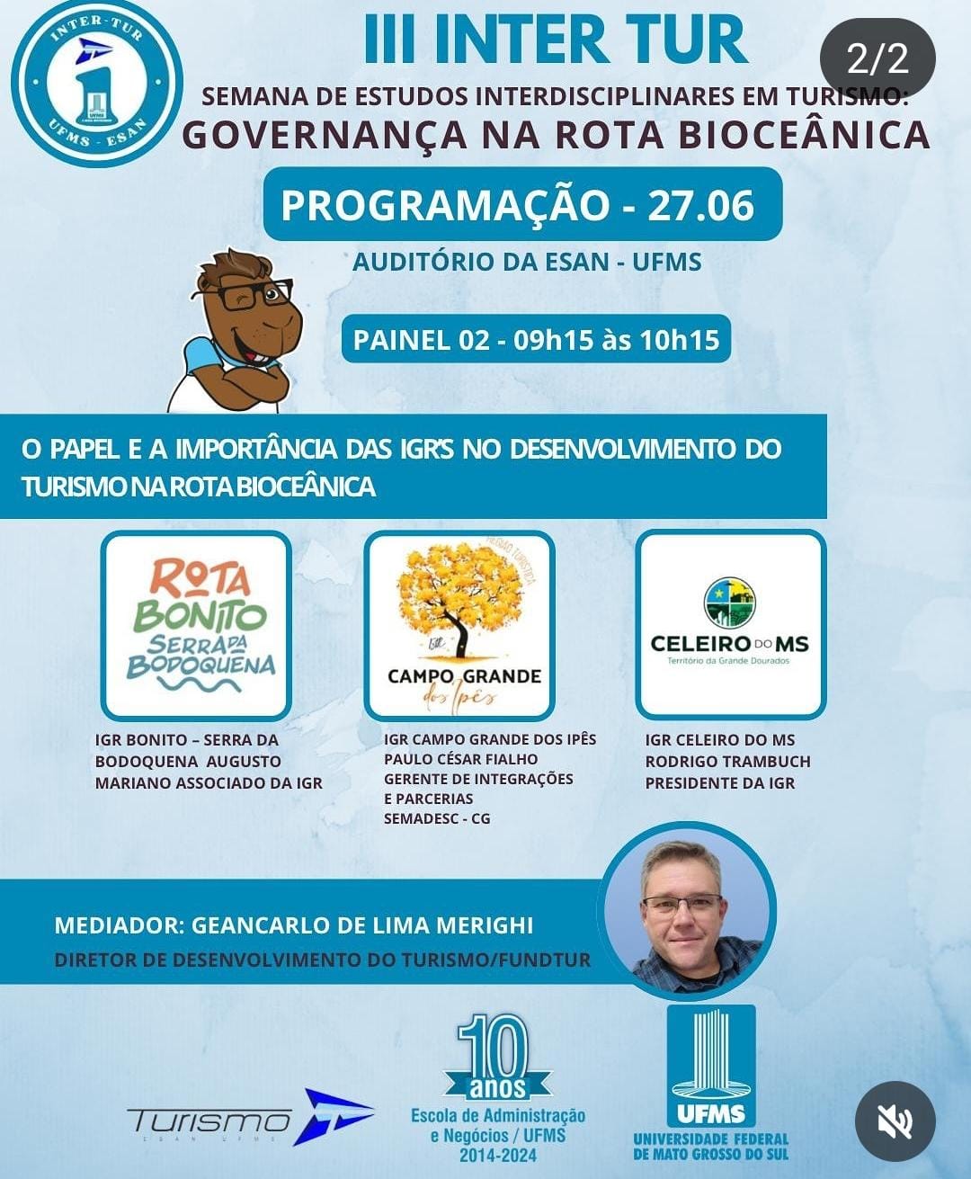 O evento marca também os 10 anos da Escola de Administração e Negócios da UFMS, reafirmando o compromisso da instituição com o desenvolvimento regional por meio do turismo sustentável e integrado.