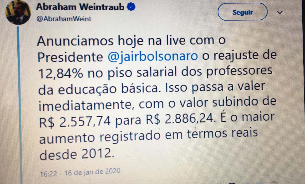O presidente da República, Jair Bolsonaro, e o ministro da Educação, Abraham Weintraub, anunciaram por meio de live (transmissão ao vivo) em rede social o aumento de 12,84% do piso salarial previsto no Fundo de Manutenção e Desenvolvimento da Educação Básica e de Valorização dos Profissionais da Educação (Fundeb). Segundo Weintraub, o reajuste anunciado “é o maior aumento em reais desde 2009.”