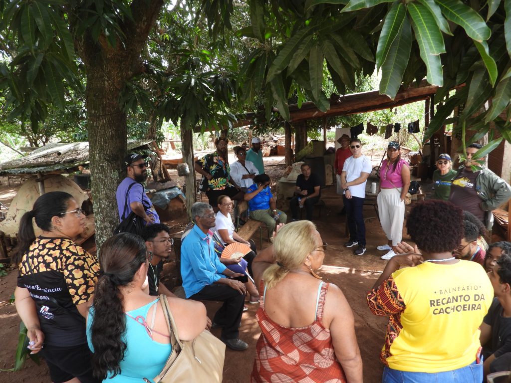 Durante a visita, os participantes ouviram histórias sobre a comunidade e conheceram Dona Maria, guardiã da memória local, que utiliza peneiras de taboca para registrar e preservar a história do quilombo. O grupo também teve a oportunidade de saborear um almoço tradicional e desfrutar de um banho refrescante numa cachoeira local.Um dos momentos mais marcantes foi a apresentação da “pizza de rapadura”, uma especialidade da comunidade, considerada um verdadeiro patrimônio gastronômico. Além disso, os jovens da comunidade realizaram uma expressiva apresentação da dança do Engenho Novo, reforçando a riqueza cultural da região. Para saber mais sobre o Quilombo Furnas do Dionísio acesse: https://www.instagram.com/quilombo.turismofurnas