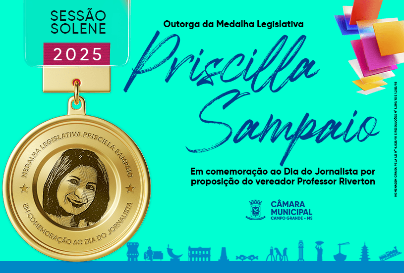 A Câmara Municipal de Campo Grande promove na segunda-feira, dia 28, às 19 horas, Sessão Solene de Outorga da Medalha Legislativa “Priscilla Sampaio”, em comemoração do Dia do Jornalista. A solenidade foi proposta pelo vereador Professor Riverton.