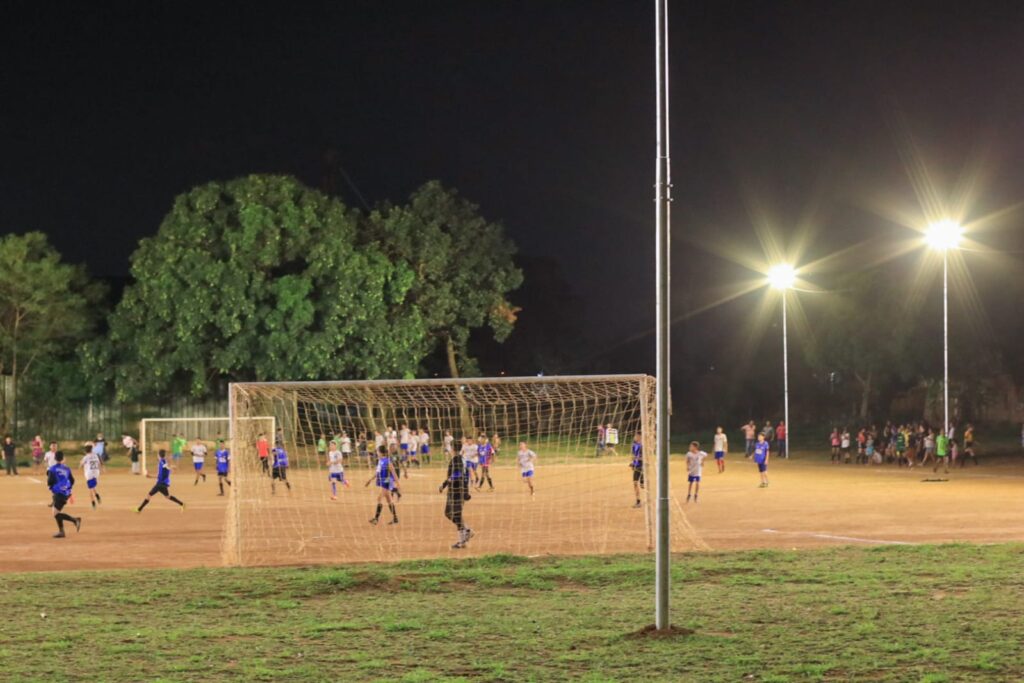 Com muita festa e três partidas de futebol, os moradores do Jardim Santa Felicidade comemoraram na noite dessa quarta-feira (06) a revitalização da praça de esportes Arena Coalhada, a mais antiga da região onde também estão localizados os bairros Moreninhas, Cidade Morena, Vila Maciel, Parque Novo Século e Vila Brasil. As obras estão no início, mas o local recebeu iluminação de LED que foi ativada na abertura da solenidade de lançamento do projeto.