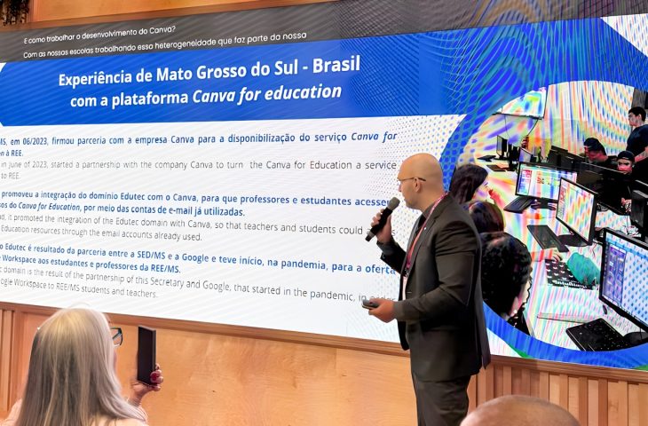 Daher palestrou sobre o uso de ferramentas em parceria com Google e Canva na REE (Rede Estadual de Ensino). O tema central da apresentação foi o uso do serviço Canva for Education, fruto de uma parceria firmada em junho de 2023 com a SED (Secretaria de Estado de Educação).