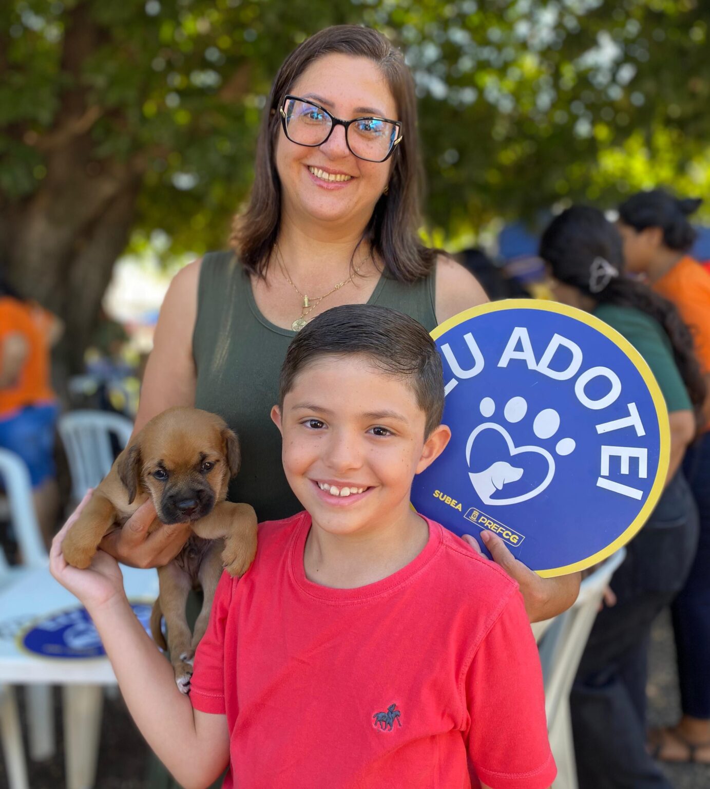 #ParaTodosVerem A imagem de capa mostra mãe e filho com cachorro adotados.
