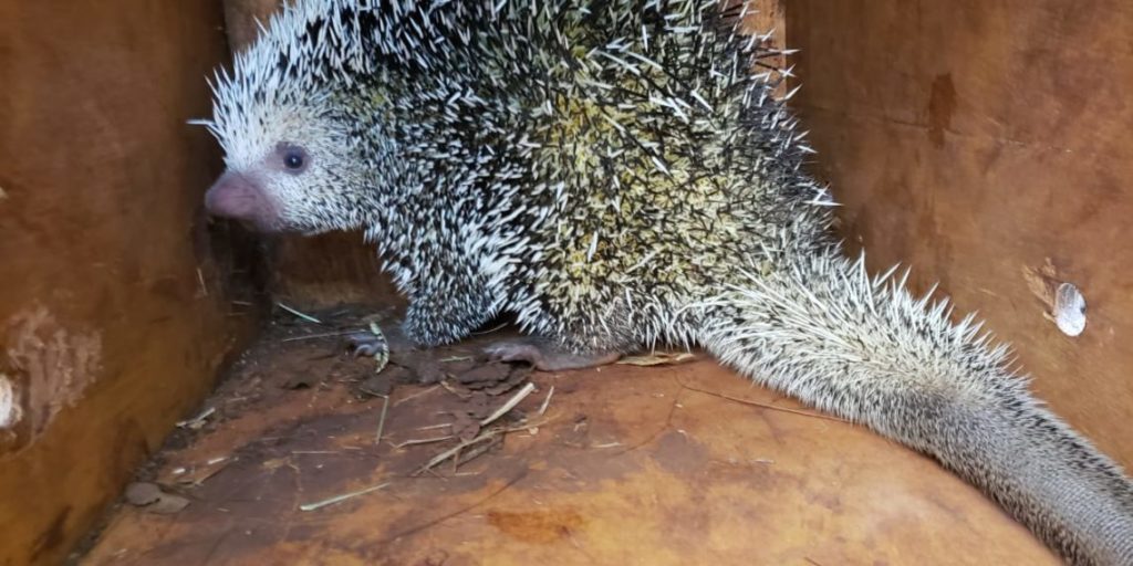 Um ouriço-cacheiro foi capturada a pouco em frente ao Condomínio Alphaville, à avenida Cônsul Assaf Trad. O animal subiu em uma árvore por causa do movimento de pessoas nas proximidades.