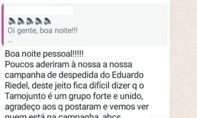 Imagem de um grupo de WhatsApp que vazou na última semana dá indícios que a campanha pela pré-candidatura de Eduardo Riedel (PSDB) ao Governo de MS enfrenta dificuldade de engajar...