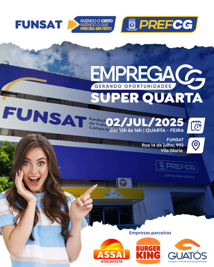 A Funsat também estará pela manhã com abordagens do Emprega CG no Centro Pop, na Rua Joel Dibo, 255. Já, durante todo o dia, das 7h às 17h, o atendimento regular acontece na Agência de Intermediação da Funsat, localizada na Rua 14 de Julho, 992, na Vila Glória, mesmo endereço da “Super Quarta”, entre as 13h às 16h.