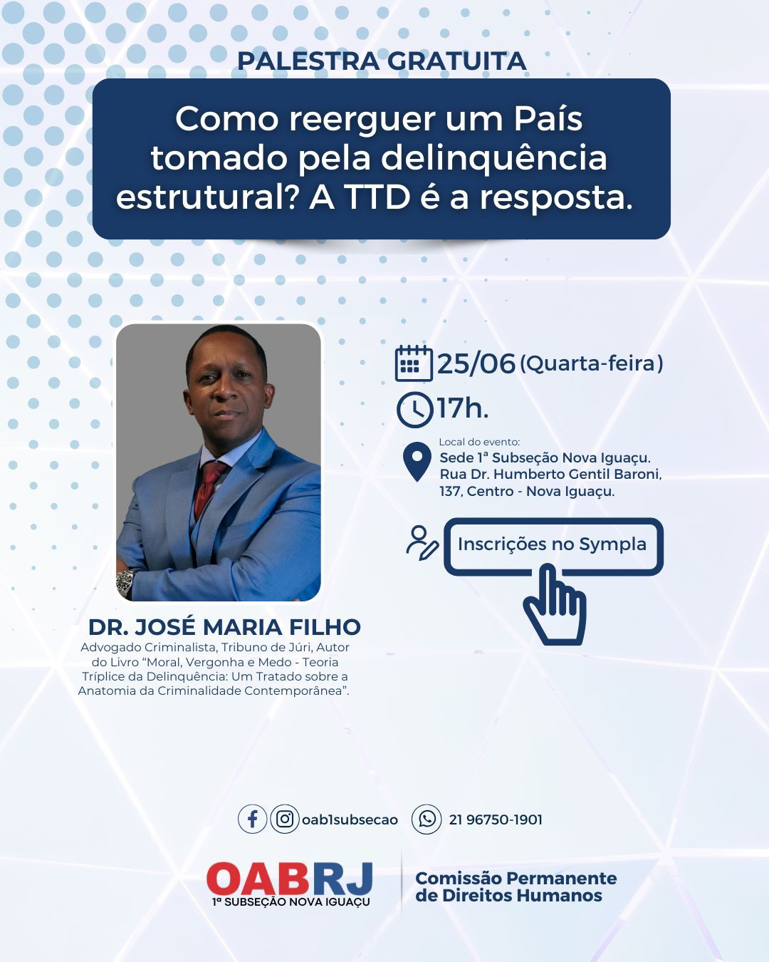 No próximo 25 de junho, às 17h, a Comissão de Direitos Humanos da OAB Nova Iguaçu, município do estado do Rio de Janeiro, presidida pelo advogado Dr. Júlio César, realiza uma palestra gratuita e aberta ao público, com um tema que toca o centro da crise atual brasileira: “Como reerguer um País tomado pela delinquência estrutural? A TTD é a resposta.”