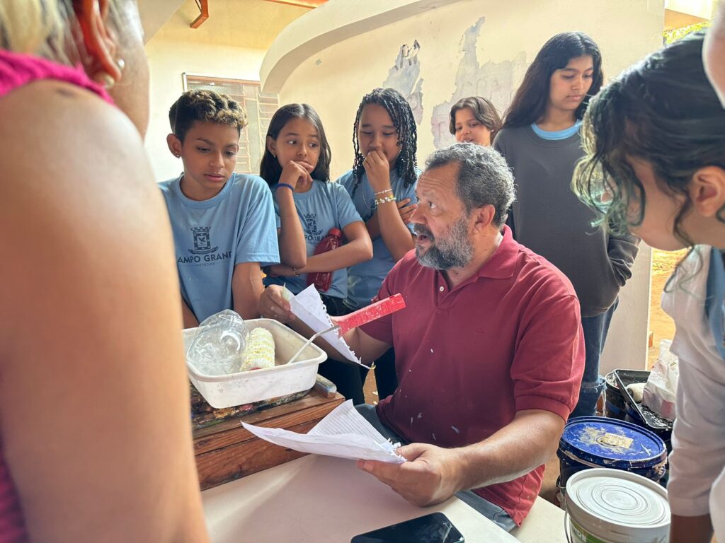 Ele conta que trabalha com alunos há mais de 15 anos e gosta da troca que existe com os alunos. “É uma oportunidade de ouvi-los e ajudá-los no caminho, porque amanhã eles podem ser o artista, eu preciso passar o legado”. Apres fala ainda sobre a pintura que será feita no muro. “Vamos pintar o ipê rosa, amarelo e branco e vai ser uma pintura coletiva, os alunos vão ajudar a pintura com meu auxílio”.