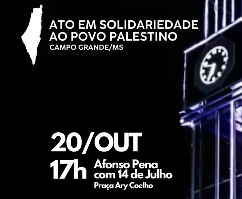 “Ato em solidariedade ao Povo Palestino em Campo Grande-MS. 20 de outubro, 17 horas, Praça Ary Coelho, na Afonso Pena com a 14 de Julho”, diz o convite.