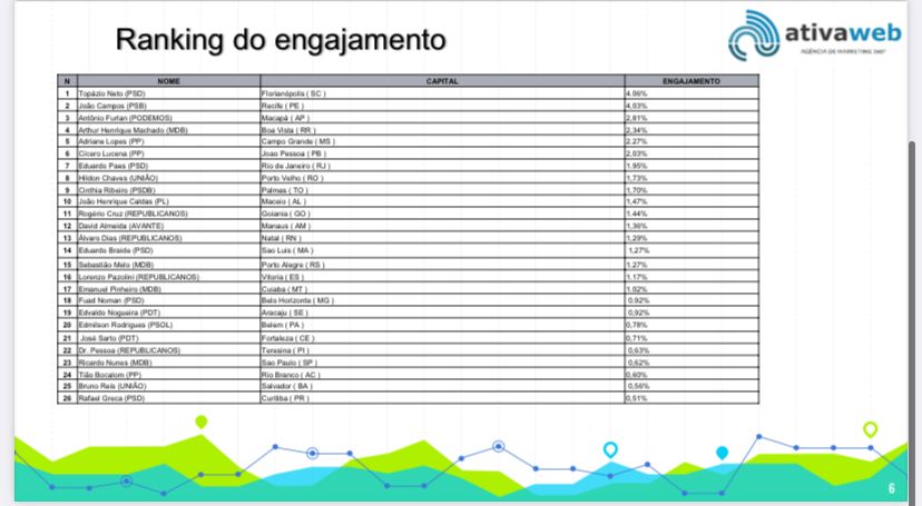 Ainda de acordo com o levantamento, na região Centro-Oeste, a prefeita Adriane Lopes ocupa o 1° lugar engajamento e uma média de 587 curtidas e 85 comentários. A chefe do executivo ocupa o topo em virtude da consistência de publicações, o que segundo o estudo são a chave para alcançar qualquer perfil.