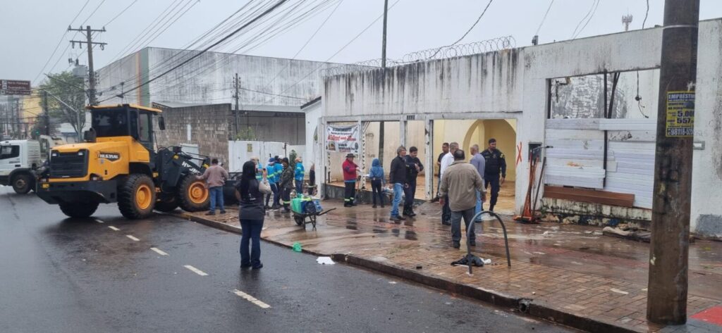 #PraTodosVerem: Fotocapa mostra tratores e equipes da Prefeitura trabalhando na calçada em frente a um imóvel abandonado, em uma manhã chuvosa. Pessoas observam e registram a ação, enquanto servidores utilizam equipamentos de limpeza. Segunda imagem: Servidores com coletes de fiscalização e agentes de segurança acompanham a retirada de entulhos do interior de um imóvel em ruínas. Um homem carrega um balde com restos de material. Terceira imagem: Dois agentes de saúde vistoriam um cômodo deteriorado, com paredes descascadas e objetos espalhados. Bicicletas, roupas e colchões estão no local, demonstrando sinais de ocupação irregular.