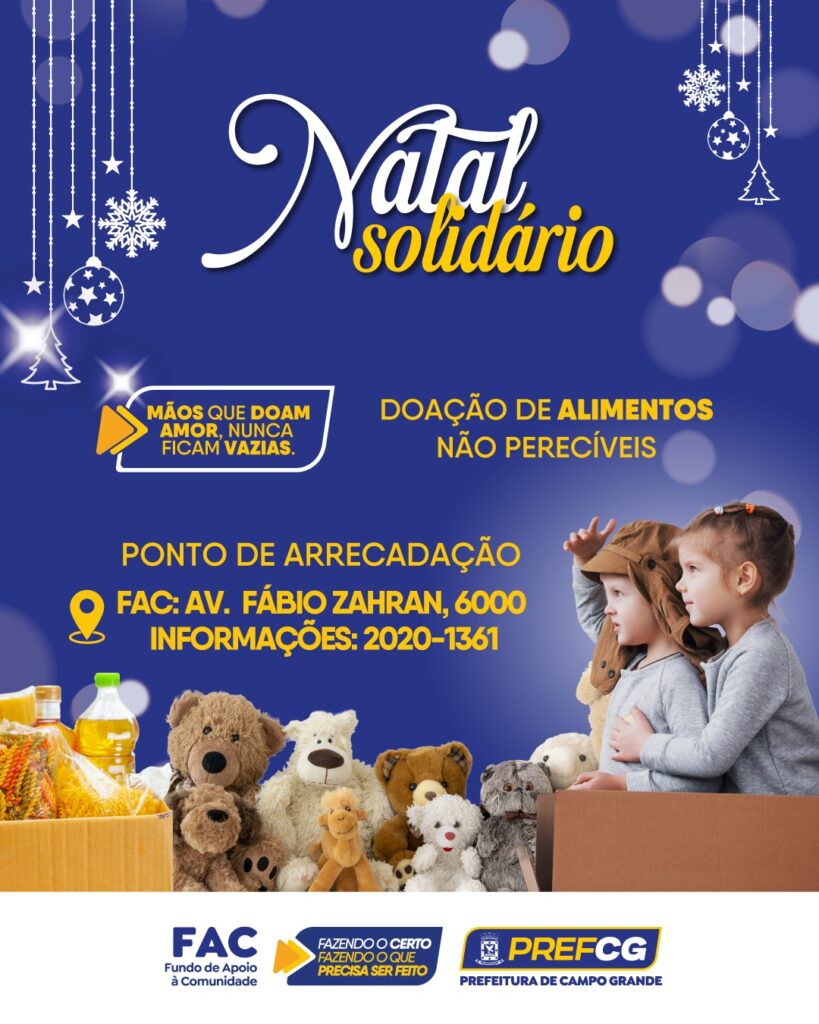 A Prefeitura de Campo Grande, por meio do Fundo de Apoio à Comunidade (FAC), dá início nesta terça-feira à Campanha Natal Solidário 2025, uma grande mobilização para arrecadação de alimentos não perecíveis. A ação tem como objetivo levar alegria e esperança às famílias em situação de vulnerabilidade neste fim de ano.