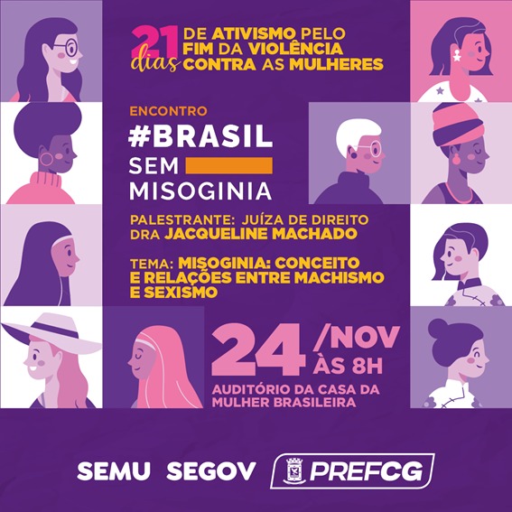 Como parte da programação da campanha de mobilização nos 21 dias de ativismo pelo fim da violência contra as mulheres, a Prefeitura de Campo Grande, por meio da Subsecretaria de Políticas para a Mulher (Semu), promove na próxima sexta-feira (24), o Encontro #BrasilsemMisoginia, com o tema Misoginia: Conceito e Relações entre Machismo e Sexismo, que acontecerá no Auditório da Casa da Mulher Brasileira.