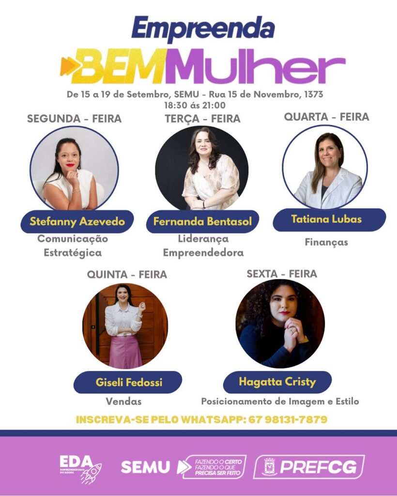 A Prefeitura de Campo Grande, por meio da Secretaria Executiva da Mulher (SEMU), realiza entre os dias 15 e 19 de setembro mais uma edição do programa “Empreenda Bem Mulher”, voltado ao fortalecimento do empreendedorismo feminino e à capacitação para negócios sustentáveis.